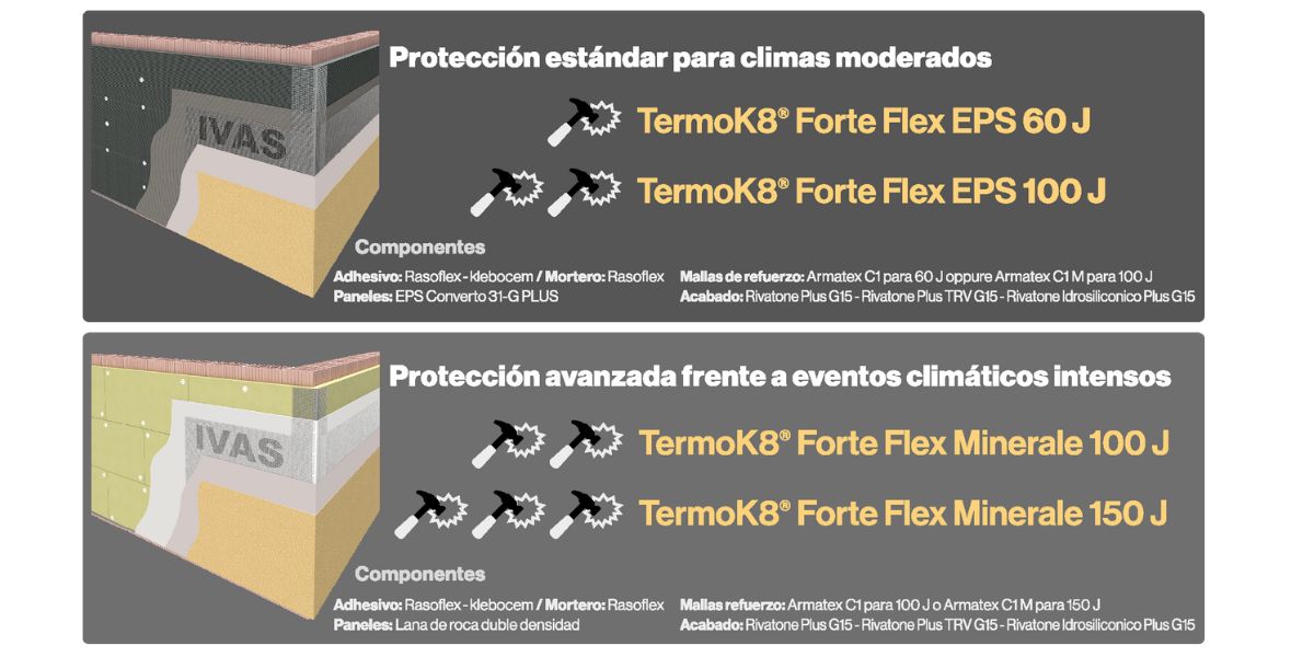 Ya sea para proteger contra posibles impactos o hacer frente a climas extremos, Termok8 Forte Flex EPS 60/100J y Termok8 Forte Minerale 100/150J son los sistemas de aislamiento térmico diseñado para resistir a impactos y garantizar un rendimiento óptimo.