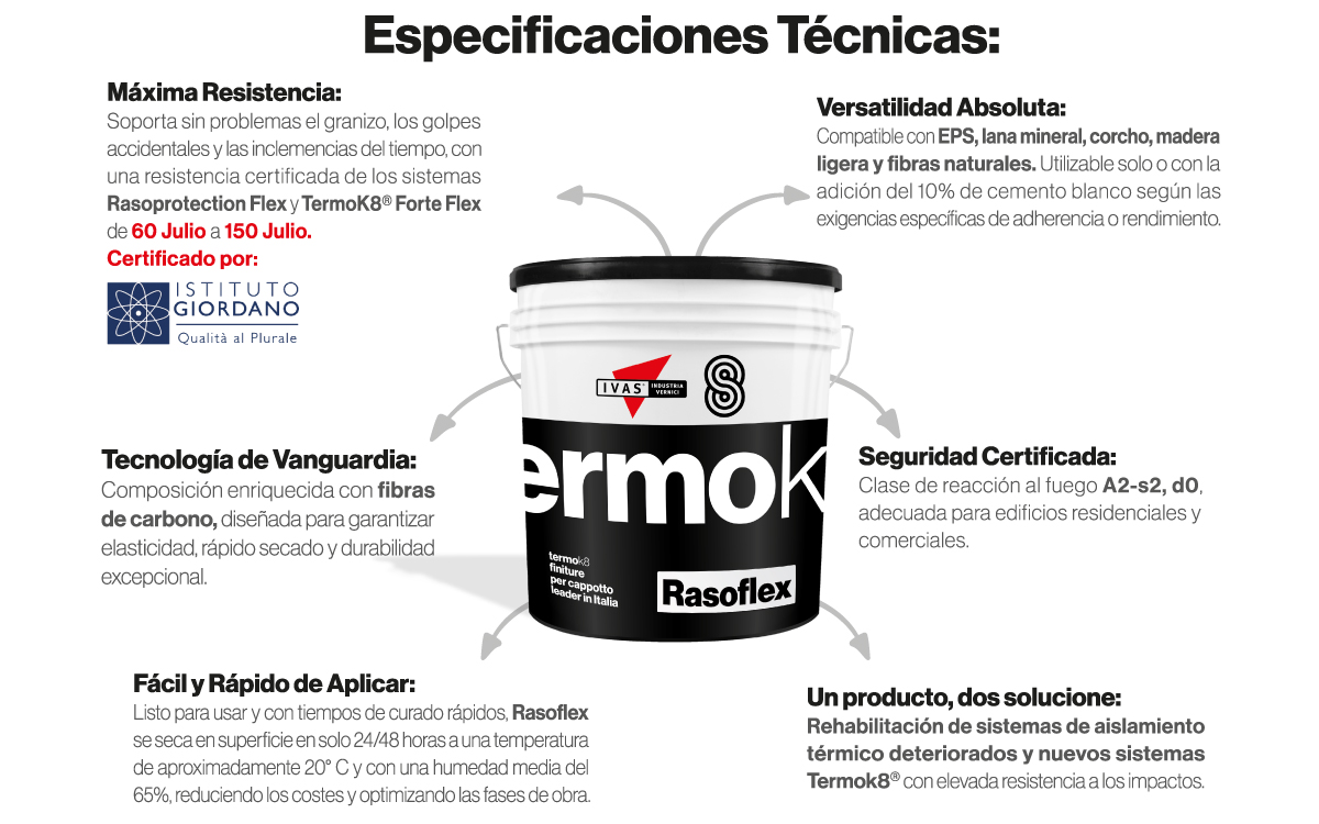 Para responder a este desafío extremo, nace Rasoflex, un adhesivo y mortero en masa listo para el uso, reforzado con fibras de carbono y diseñado para sistemas antigranizo y de reparación, concebido para garantizar la máxima protección y durabilidad.